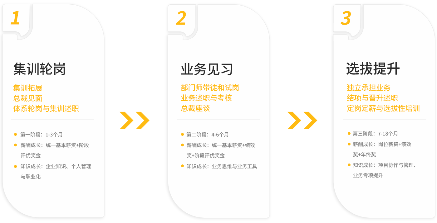 面試結(jié)果決定同學(xué)們是否能成為世友管培生。被錄取的同學(xué),薪資成長(zhǎng)將分為以下三階段:(1-3個(gè)月):統(tǒng)一基本薪資+階段性評(píng)分獎(jiǎng)勵(lì);(4-6個(gè)月):統(tǒng)一基本薪資+績(jī)效工資+階段性考核獎(jiǎng);(7月以后):會(huì)根據(jù)部門及確定崗位的特質(zhì)確定不同的薪資標(biāo)準(zhǔn)。